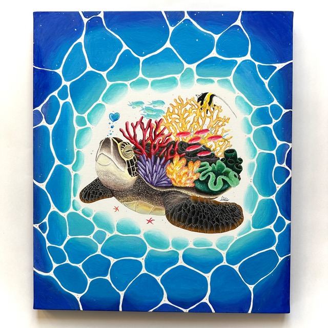 2024年3月5日「さんごの日」に、 描いたウミガメをF10号サイズの キャンバスに描いた原画です。 甲羅に広がる色鮮やかな珊瑚と魚たちは、 海の生命力そのもの。 静かに泳ぐウミガメの表情には、 生命力みなぎる海の世界、 ゆるぎない穏やかさを込めています。 「ずっと、美しい海が続きますように」 そんな願いを込めて描きました。 光が当たるとキラリと光る、 グリッター素材の画材も使っています。 ☆仕様 ・キャンバスアート(原画) ・サイズ:F10号 H53cm × W45.5cm ・背面に壁掛け用の紐付き 2024年グループ展、2025年イタリアで 展示した一点ものの原画です。 動物をテーマに描かれた作品集 『ANIMAL2025』にも掲載されました。 ☆ご注意 ※ご利用のモニターにより色味が異なる 場合があります。 ※イメージ違いでの返品はお受けできません。