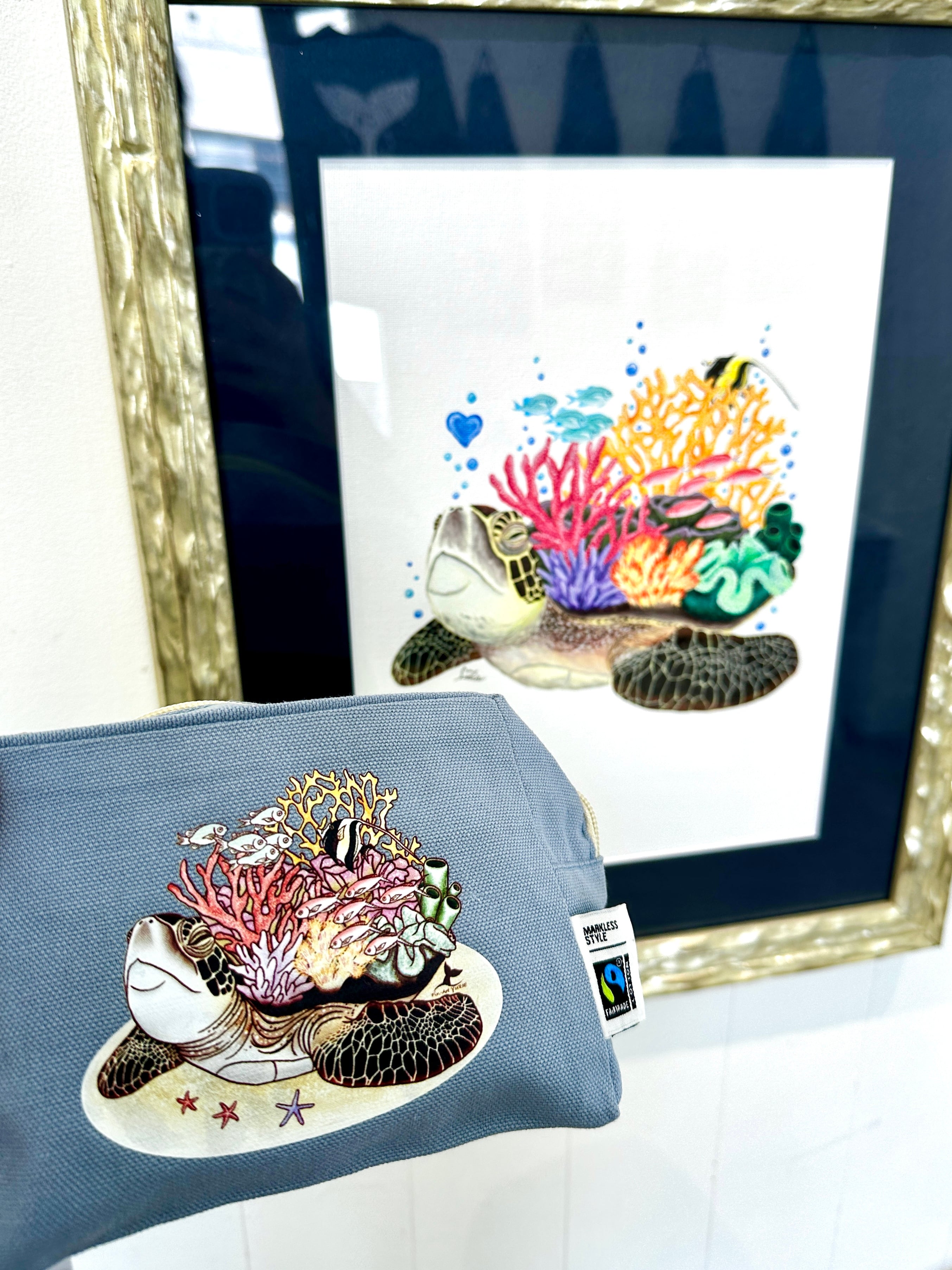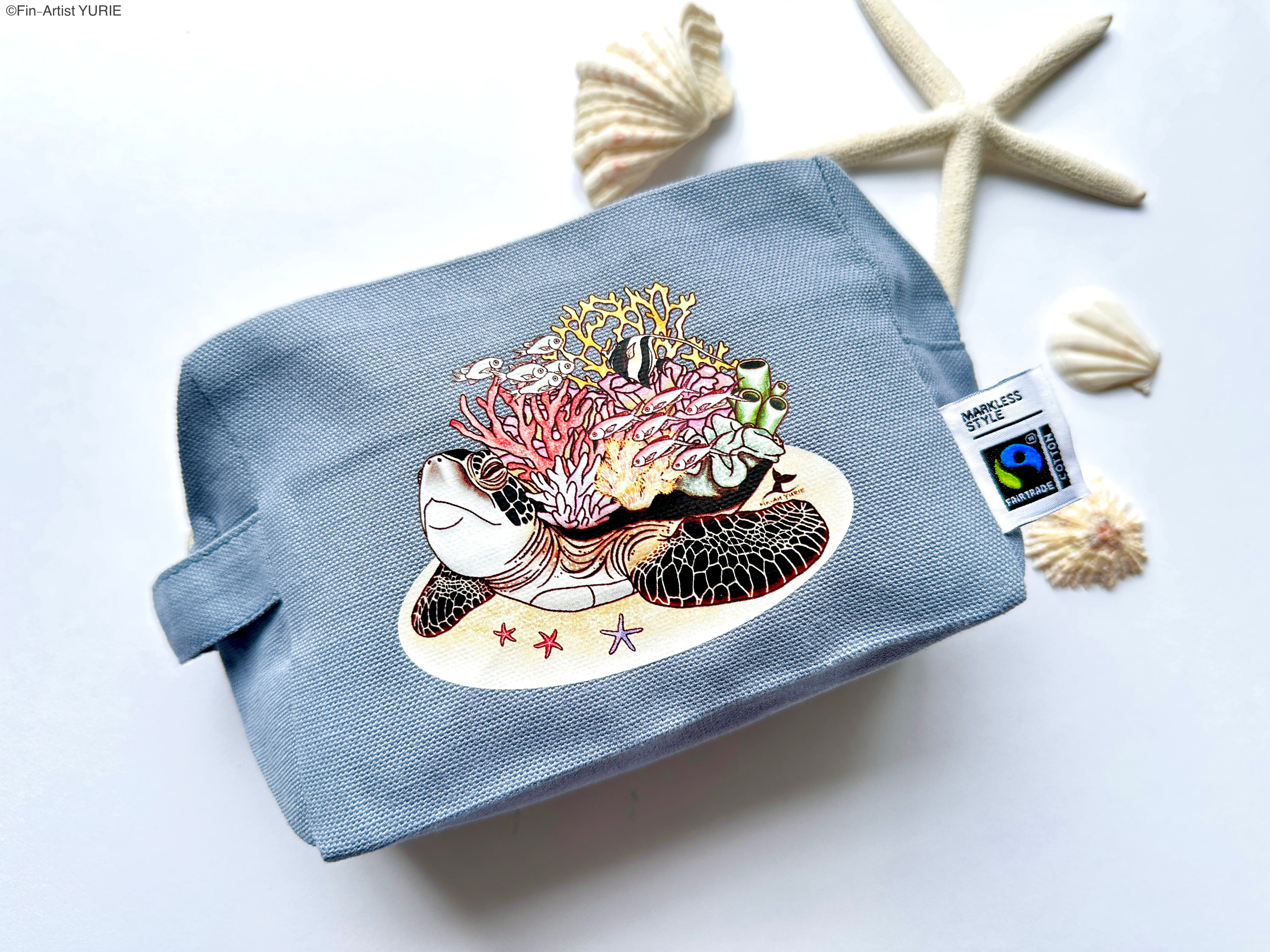 珊瑚ウミガメがコロンとかわいいポーチに